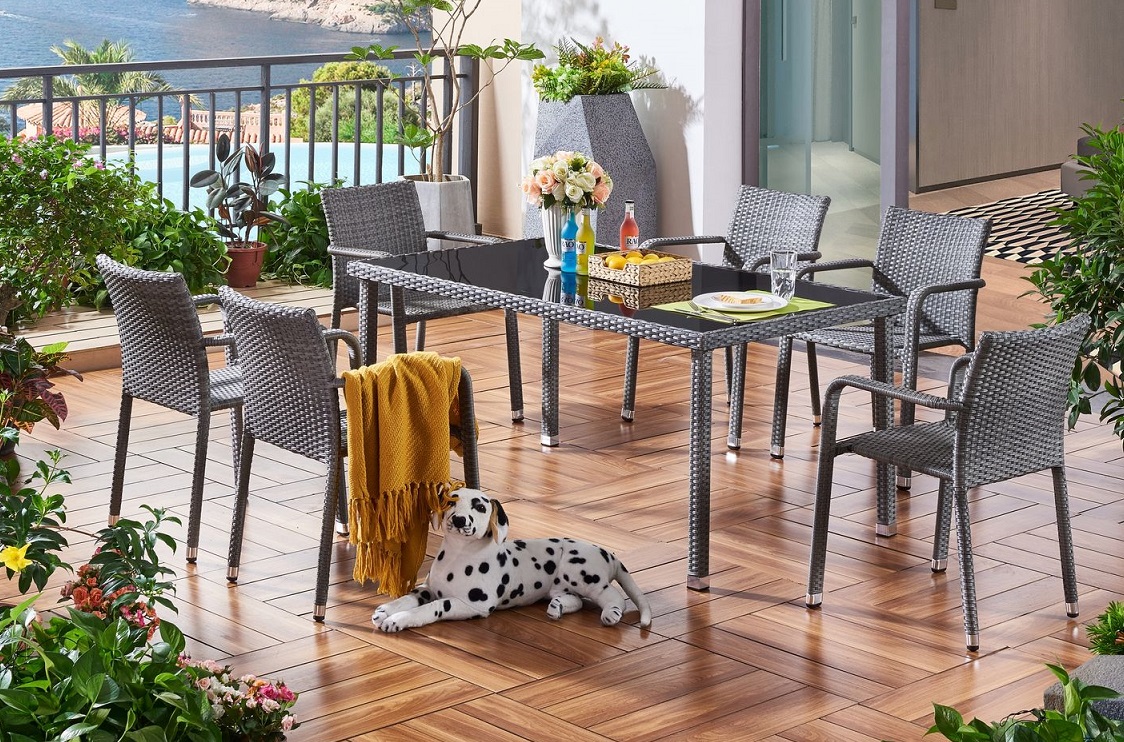 Steel rattan armrest chair=6 size: W56xD58xH81cm steel tube: 49x20xT0.8mm+Dia.28xT0.8mm; Alum decoration legs. steel waving glass table=1 Overall size: L150xW90xH72cm; table edge and legs with rattan steel tube:40x40x0.8mm Zine coating and power coating finish T5mm tempered glass Full K/D packing